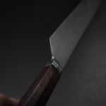 240mm blade. The damascus is random pattern from 15n20 and 1084 carbon steels. I was aiming for about 200 layers with this billet but forged thick and ground many of those layers away. The results are quite low layering at the rear of the blade and much tighter layers at the tip. The handle is ringed gidgee with a stainless pin, the spacer is zirconium. All transitions between pin handle spacer and blade have had a micro heirlooming to ensure no sharp corners emerge as the timber expands and contracts with changes in humidity. The balance point is right on the makers mark - with the swooping plunge lines the knife fits and balances perfectly in a pinch grip.