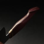 The blade is from 15n20 carbon steel and is 3mm at the spine with a mostly flat geometry. Carbon steel may not be as tough as stainless and may not maintain an edge like the top stainless blades - but it is such a pleasure to sharpen comparatively and the beautiful patina you can grow over the years is just not available with stainless. I have added some distal taper along the length and the result is a blade that slices amazing at the heel and like magic at the tip.
