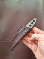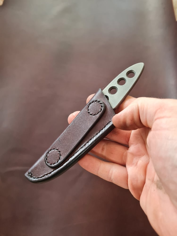 This is a very slim and pocketable little EDC, full flat grind, jimping top and bottom, with a super resillient etched and steel wool scrubbed stainless N690 finish. 5mm thick, 3" blade length and 100g all up weight. Comes with a choice of a kydex or leather sheath.