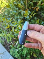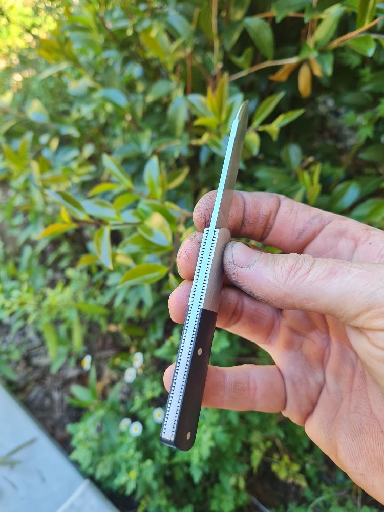 Blade and spring are stainless CPM154, I've used 416 for the liners bolsters and pins and g10 on the scales. Blade runs on phosphor bronze washers and is 2mm thick 57mm along the edge and 14mm wide.