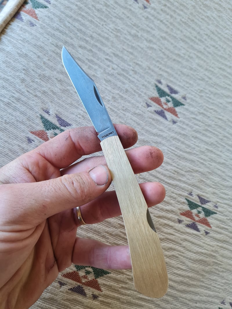 Brass scales, carbon damascus blade. CPM154 lock bar and spring. Blade is 80mmm x 13mm, 135g total weight, 115mm when closed.