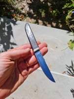 Another little paring knife. Made from 1.7mm thick 15n20, total weight is 47g, sharpened portion of the blade is 80mm. Brass ferrule and pin on a scorched and waxed jarrah handle. This steel will patina gently if treated with care and will rust if neglected.