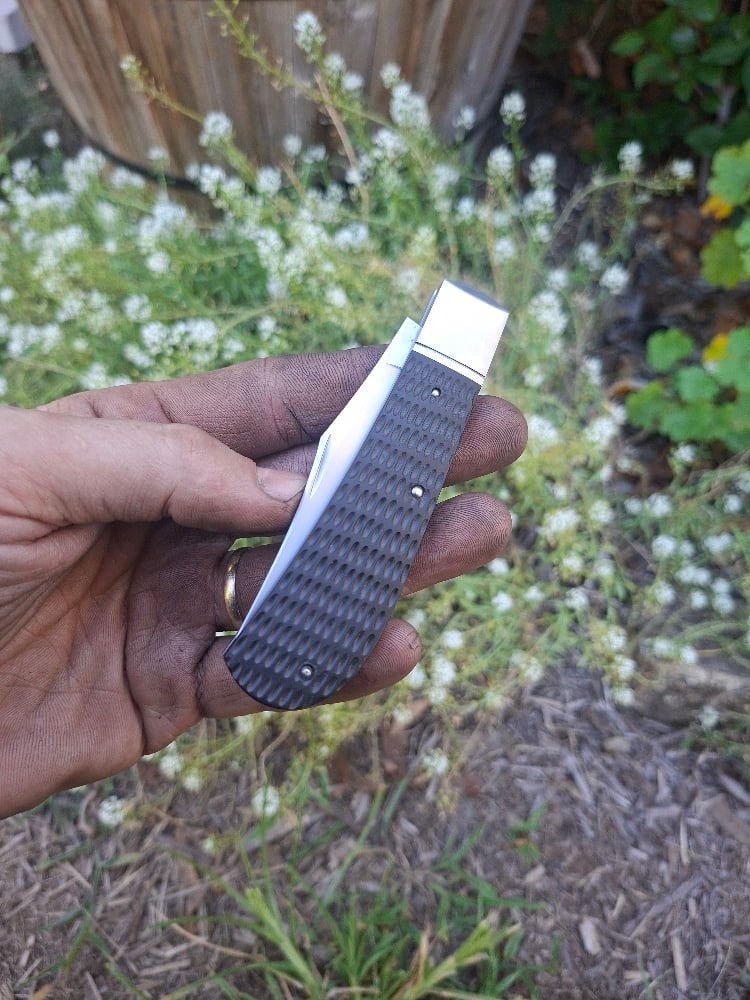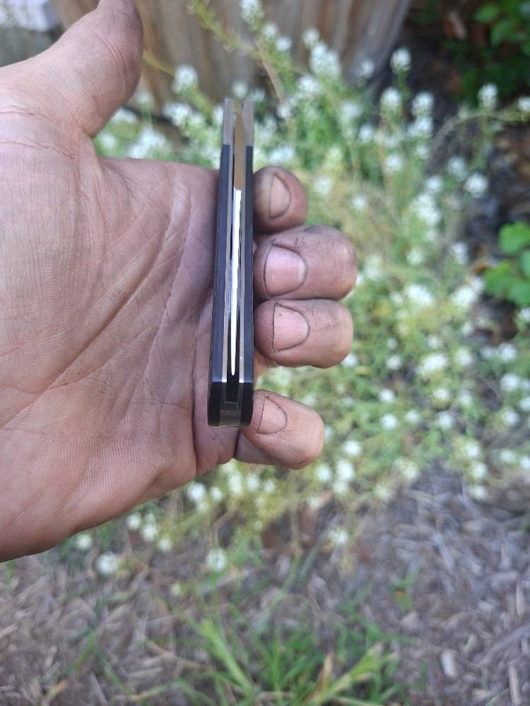 Rwl34 blade and spring. 416 liners bolsters and pins. File worked liners. Spun pins. Jimped richlite scales.