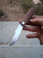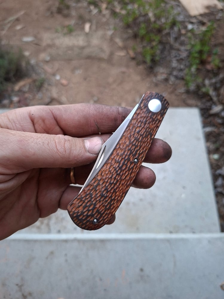 Rwl34 blade and spring. 416 frame pins and soldered front pivot support. Jigged and scorched naural micarta. 75mm blade. 106mm closed.