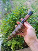Steel is from Dane Standen, core is 1084 carbon steel blackened with a coffee etch. Handle consists of a blued mild steel bolster, nickel silver spacer and a stabilised mun ebony wa style timber block. Cutting edge is 165 mm long.
