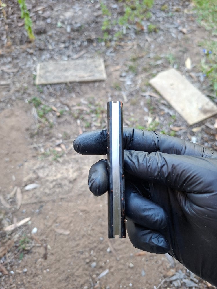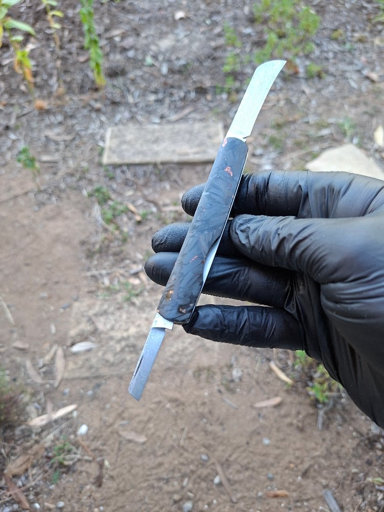 105mm when closed, blades are 30mm and 55mm. Damasteel's stainless Damascus "Rose" pattern. Liners a re 416 stainless, scales are copper foil and carbon fiber in resin.