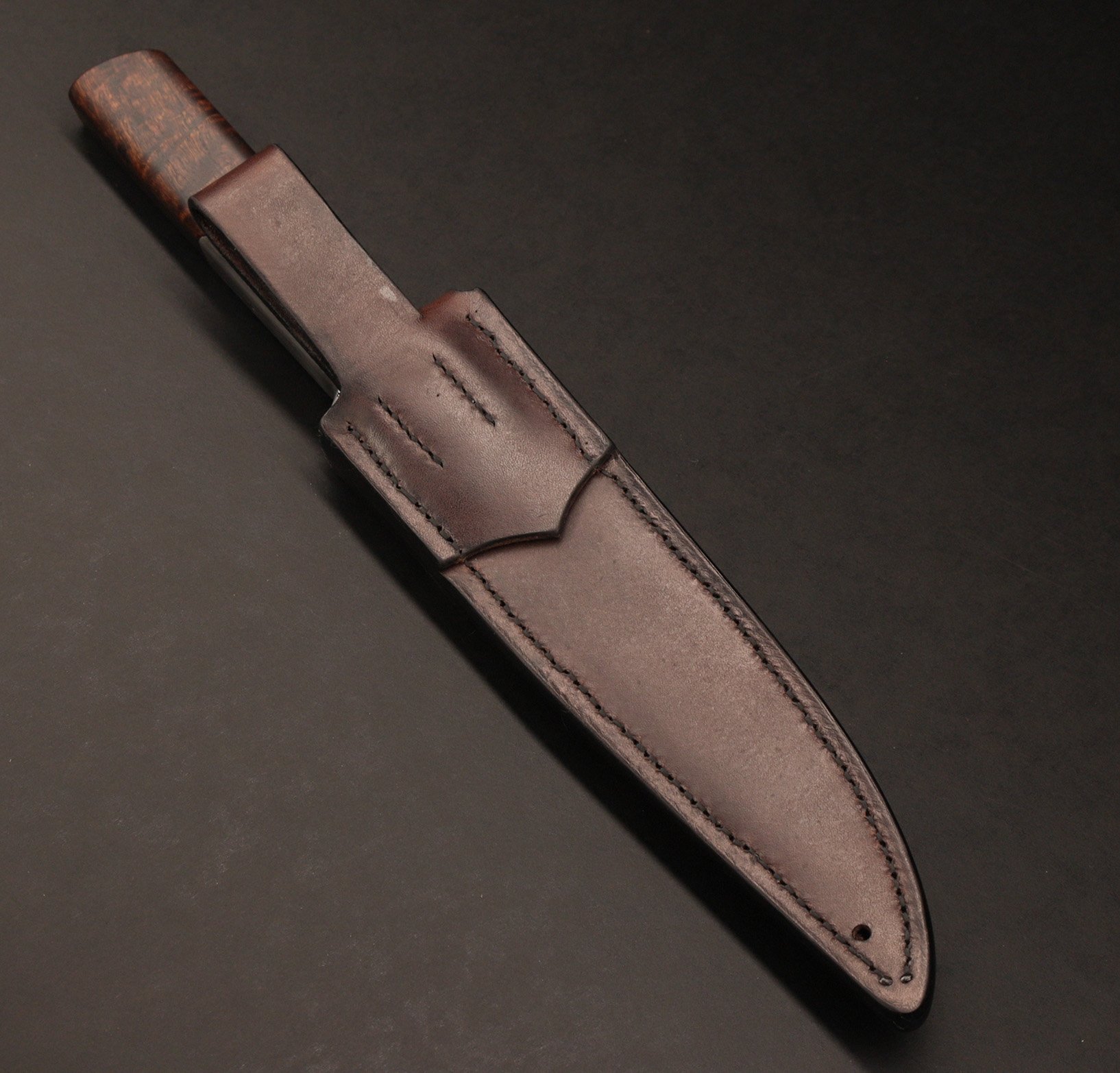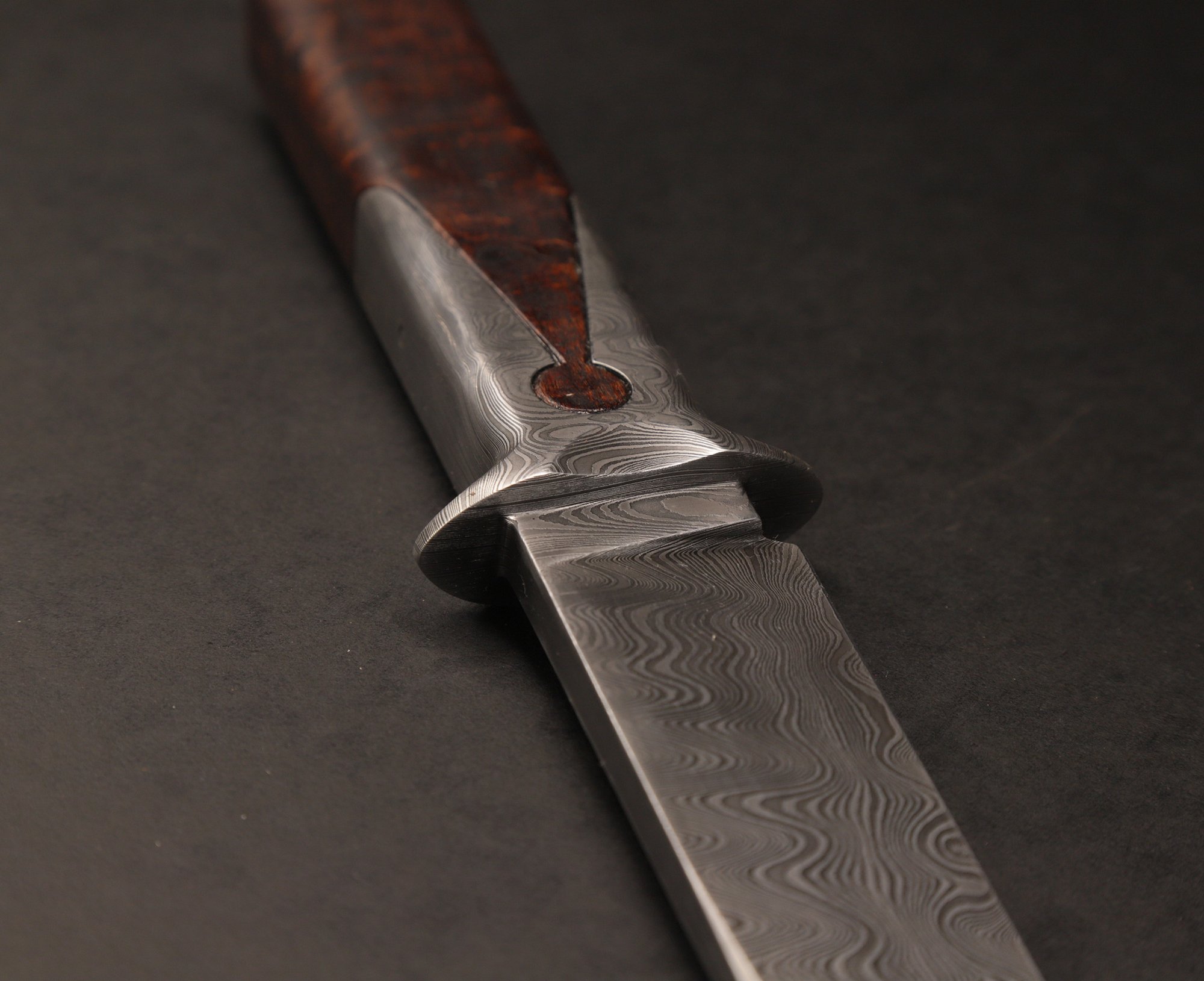 The initial steel billet was 261 layers of 15n20 +1084 , the timber is ringed gidgee. I've had a go at heirlooming the fit up and it has a domed 416 pin.
