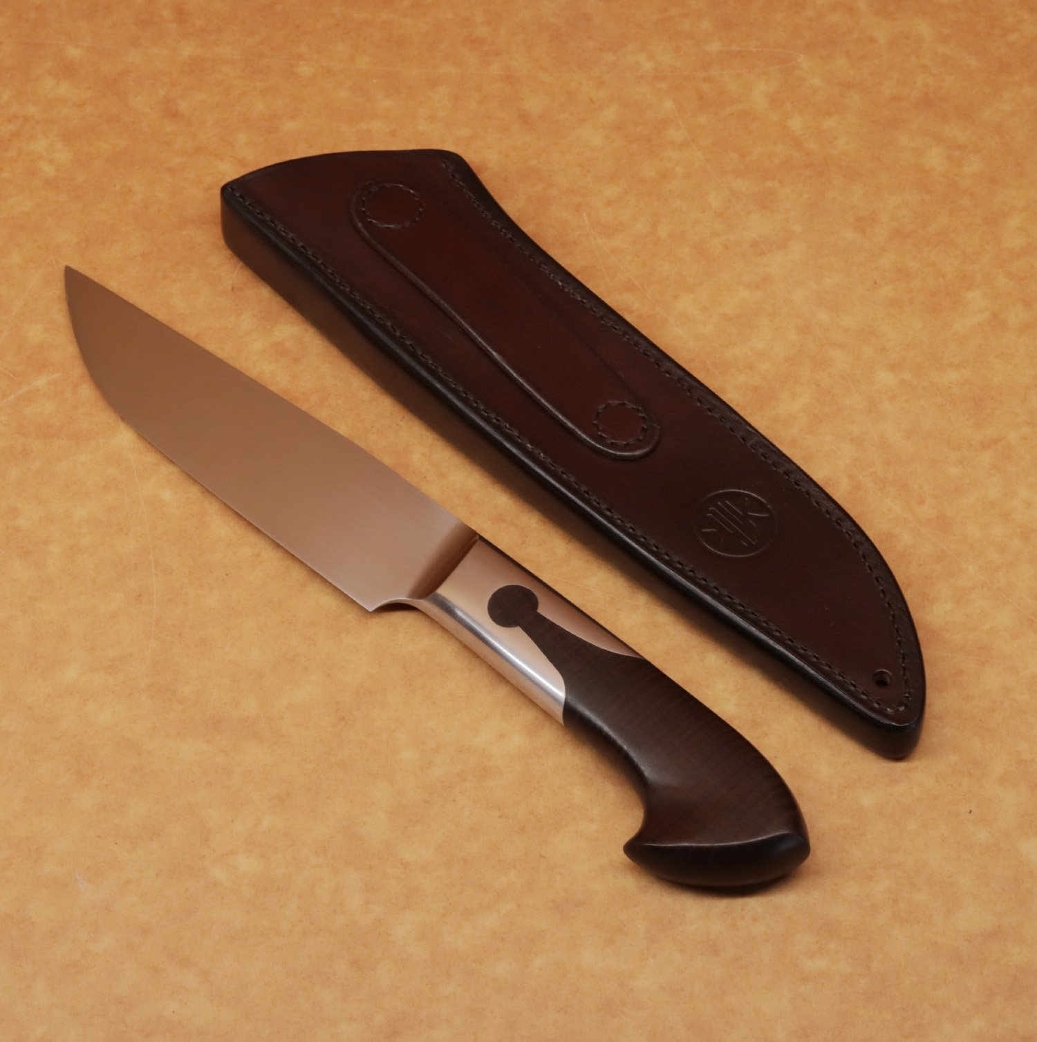 The sheath is constructed from premium Italian leather with a full thickness welt, the inlay is crocodile. Hand stitched, hand dyed and hand burnished edges.