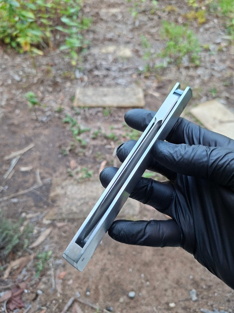 100mm blade length, handle is about 160x30mm. Blade is 6mm thick. Nitro v on the blade lockbar amd spring, aluminium on the scales. False edge on the back.