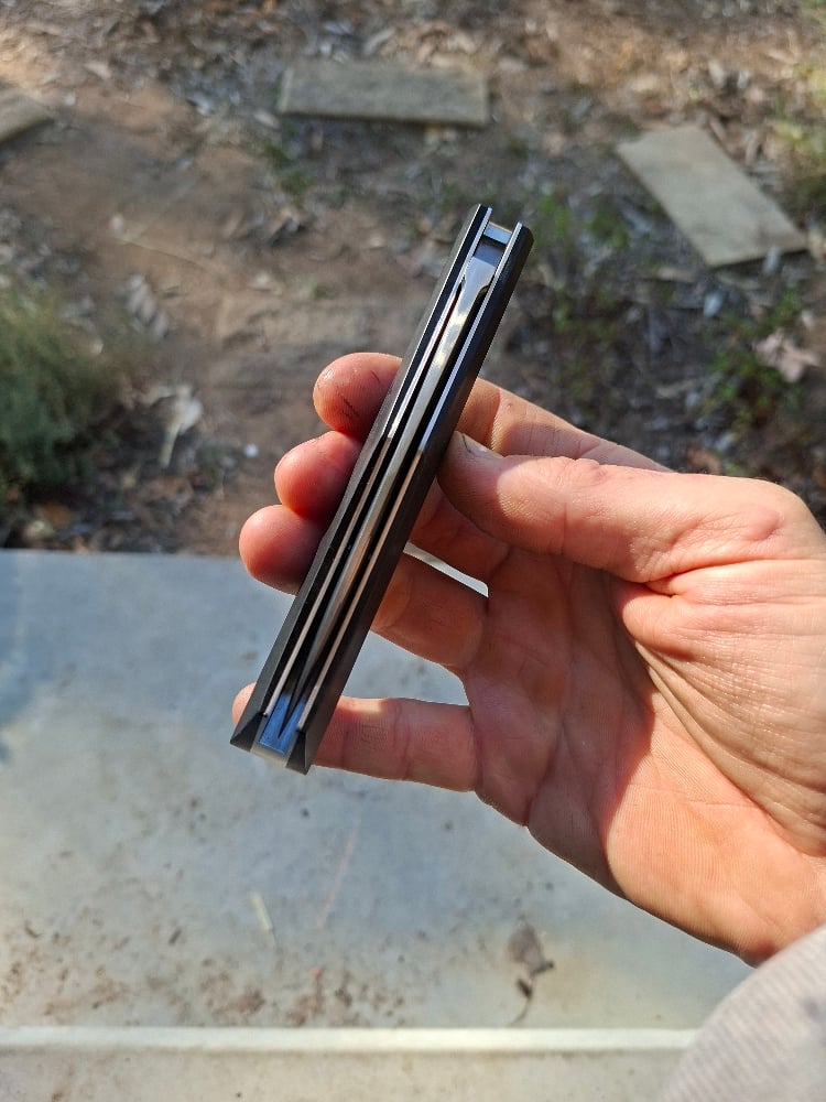 Richlite and 416 on the handle, nitro v blade spring and lock bar. 133mm when closed, blade is 103mm x 18mm x 5.5mm thick, taken to 1000 grit and polished. Maker's mark is stamped on brass and soldered to the lock bar. Total weight is 160g