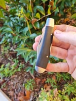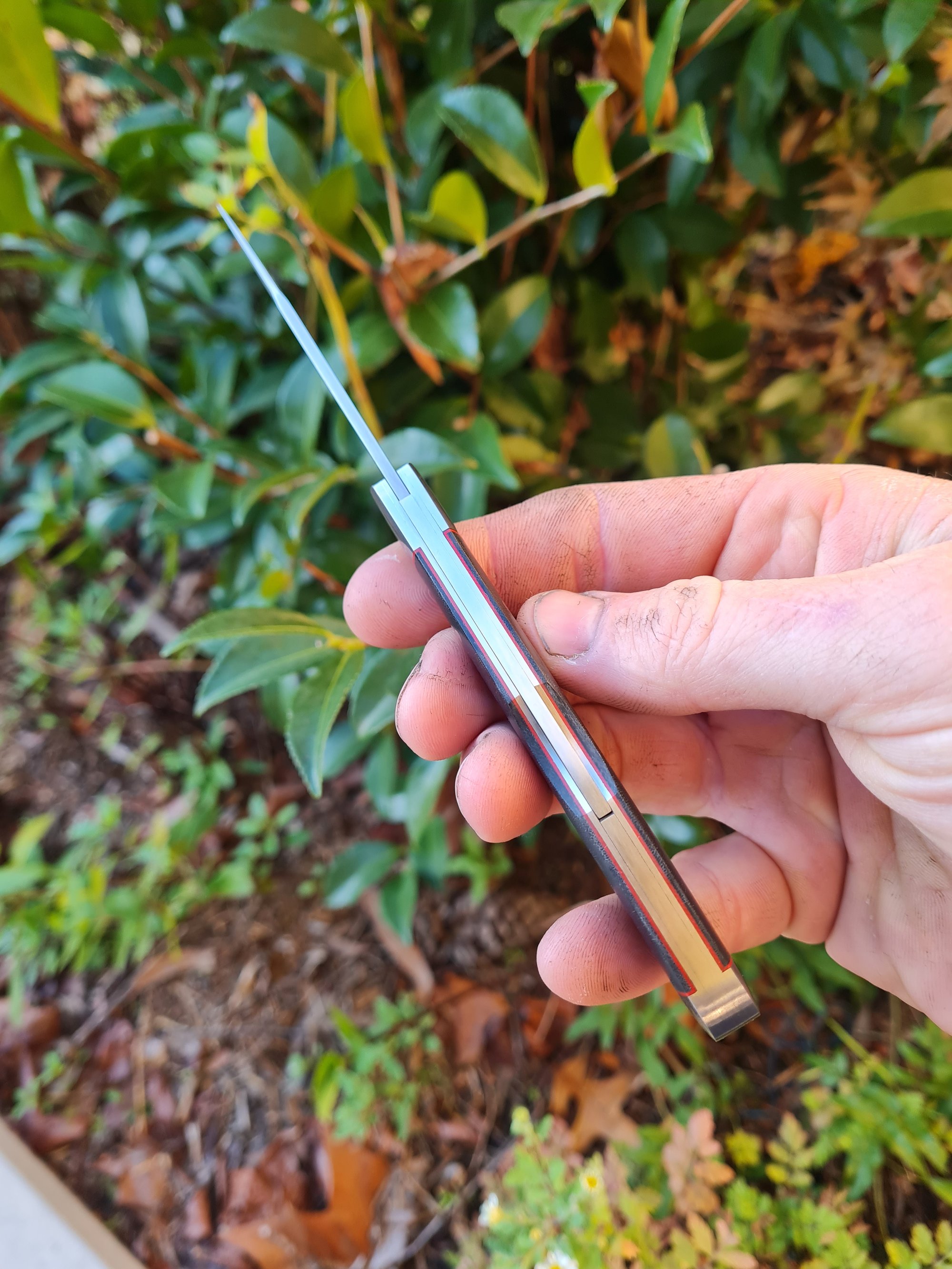 Carbon damascus steel blade, CPM154 lockbar and spring, 416 frame, red g10 and canvass micarta scales. 110mm claosed, 80x10mm blade.