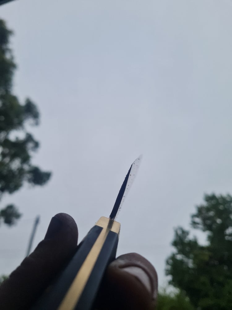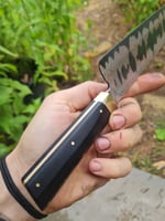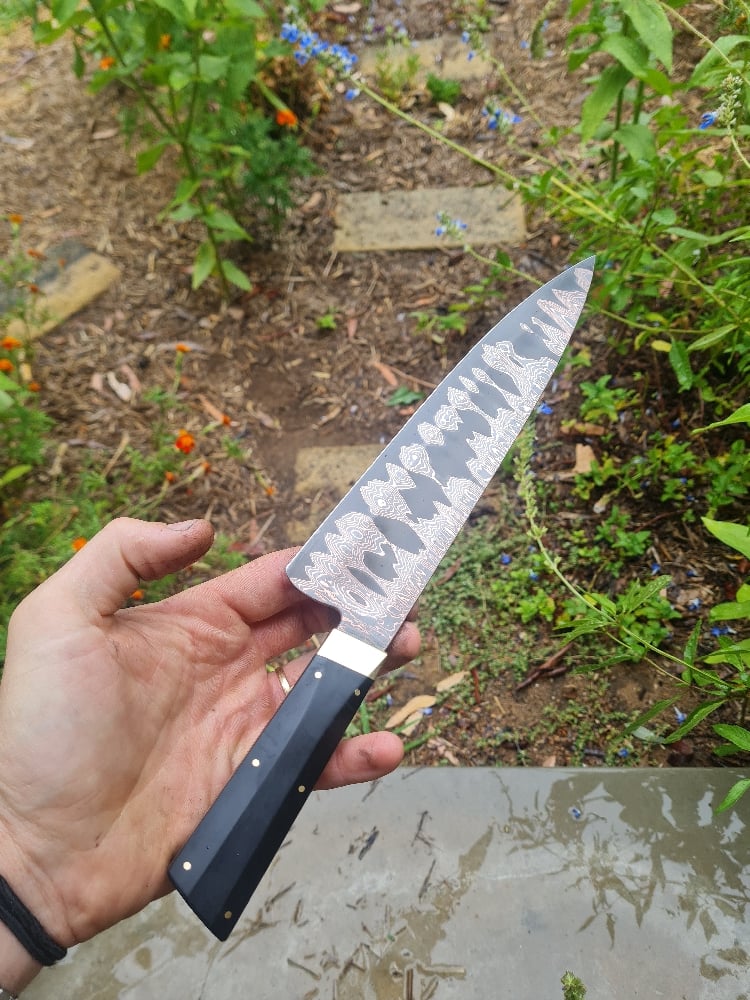 The blade is from copper + mild steel clad 1084 high carbon steel from Dane Standen, another Australian knifemaker. This chef knife features a double hollow or "S" grind, the handle is constructed of a soldered brass frame tang and richlite paper micarta scales. The blade is 3mm thick, 230mm long and 53mm tall at the heel. 270g total weight. Rounded heel and spine.