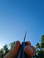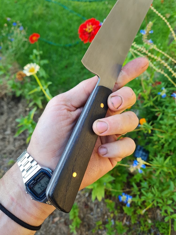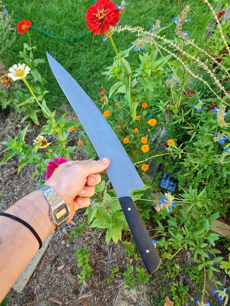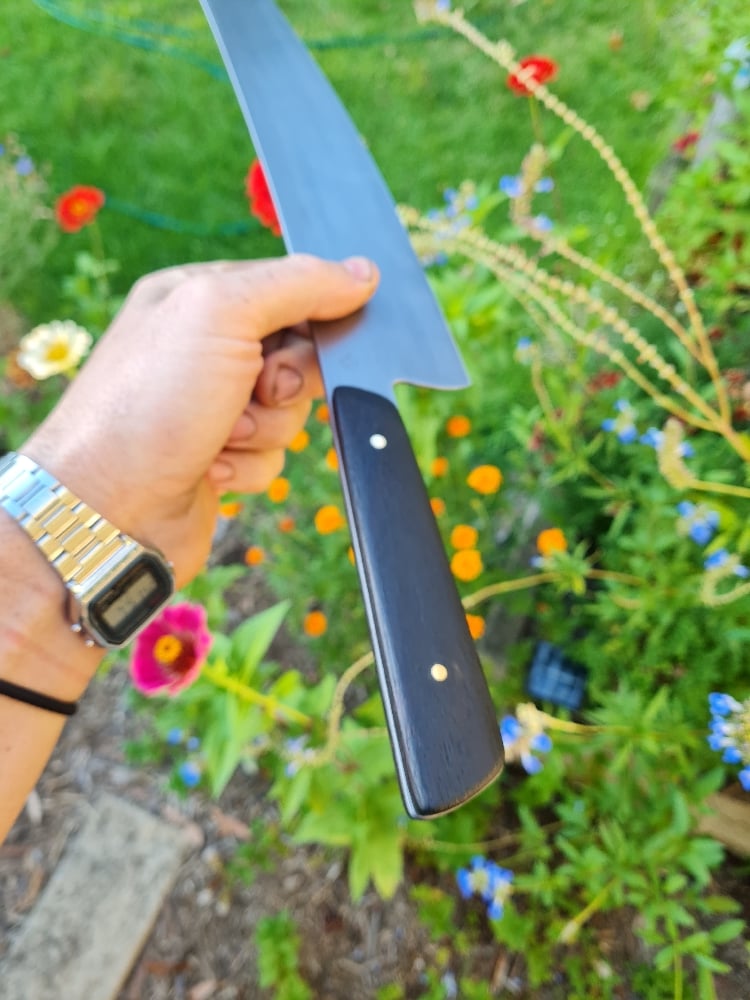 This is the biggest knife I've made. 355mm long blade, 55mm tall at the heel 490mm overall length, steel is (non stainless) carbon 1084. I have ground my typical chef profile so it's a very slicey setup and comes in at a very reasonable total weight of 350g. Spine and heel have been rounded, scales feature a small rounded step fitup to the knife and are of scorched jarrah with brass pins, blade is acid etched and steel wool rubbed. A great knife for a big brisket or perhaps slicing your full length baguettes in one go.