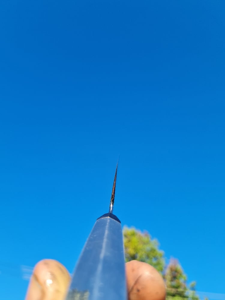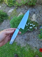 145mm x45mm stainless nitro v blade with a 2.5mm spine. Polished choil and spine. Titanium damascus bolster, solid aluminium handle. 170g, balance is 30mm back from the makers mark.