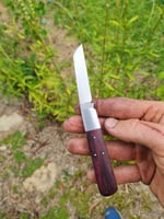 Another sweet little slipjoint. 60mm long flat ground blade, the knife is 95mm when closed. CPM154 for the blade and spring, 416 stainless liners and bolsters. Scales are pink g10 and stabilised Purpleheart. This one has a cam action instead of a 3 position stop.