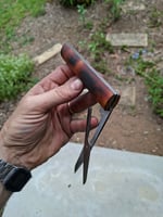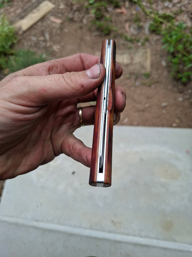 Nitro v blades and spring, 416 liners, scorched paper micarta scales. Handle / scales portion is 20x 135mm, the scissors blades themselves are 43mm. Spring is firm. Running on phosphor bronze washers. This is my 4th set of scissors, they are all machine finished.