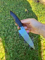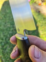 Blade is 2.5mm thick nitro v, ferrule and pin are stainless 416 on a stabilised wenge handle. 155x44mm blade, 300mm overall length and 147g all up weight.