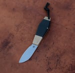 Coffin handle folder, 110mm closed, 180mm open. Blade and spring are CPM154 stainless steel. The handle is brass and paper micarta, soldered dovetail bolsters and peined brass pins. The cross is inlaid brass, glued pinned and peined. The blade is on phosphor bronze washers. This is my 3rd slip joint.